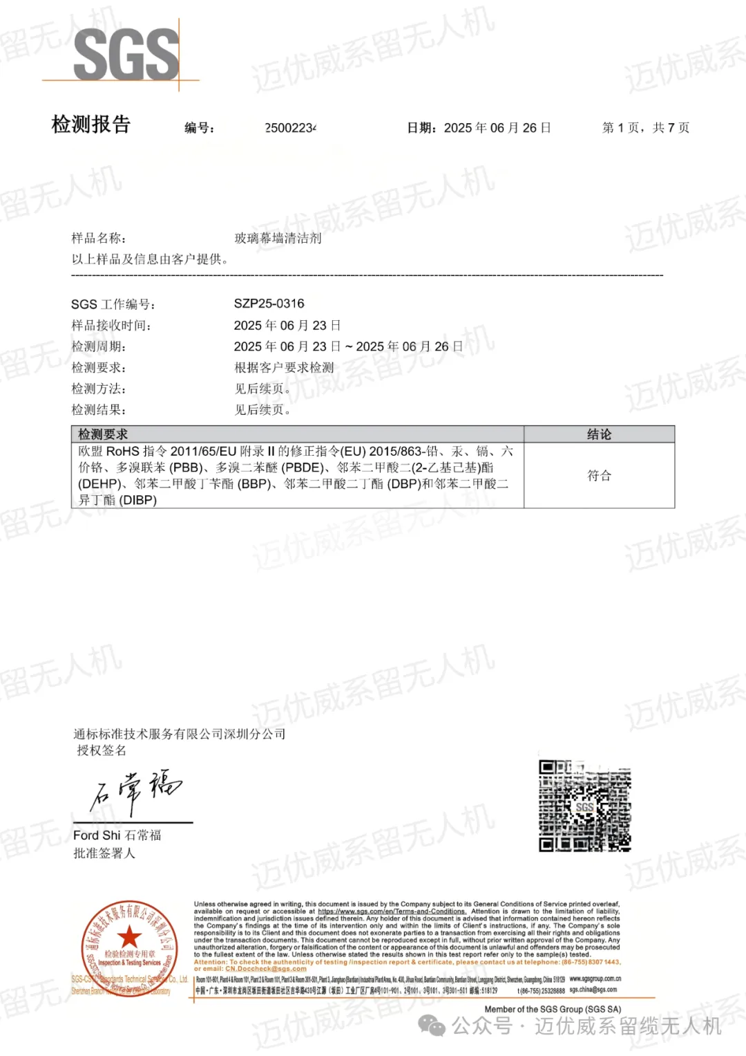 迈优威作为专注于高空清洁系留无人机研发的创新企业,始终将产品安全与环保性能置于******。近日,迈优威所使用的玻璃幕墙清洁剂正式通过全球******的检验、鉴定、测试和认证机构——瑞士通用公证行(SGS)的第三方检测认证,全面符合欧盟RoHS指令(2011/65/EU及其修正案(EU) 2015/863)的严格标准。