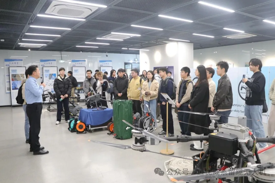 在交流过程中,迈优威讲解人员向香港大学师生详细介绍了系留无人机在多个领域的创新应用:面向高空清洗作业的稳定平台、应对城市消防灭火的快速响应系统、保障应急通信的中继解决方案,以及支持科学研究的空中照明探测平台。通过实物展示与技术讲解,来访师生对系留无人机的持续续航能力、多场景适配性以及实际应用价值有了直观认识。